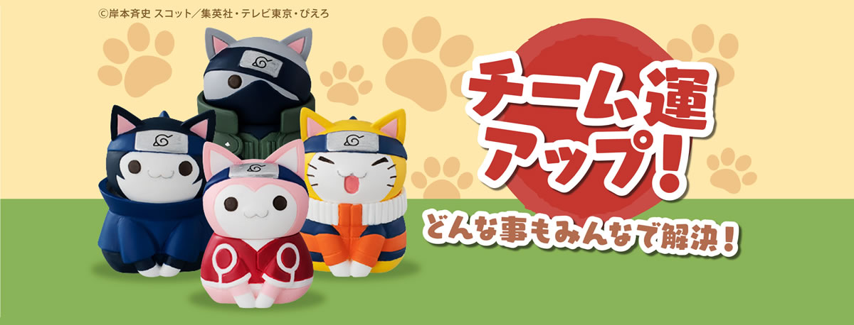NARUTO-ナルト-に登場するキャラクターたちが、何故か「猫(にゃんこ)」なデフォルメマスコットになって登場! 全高約3センチサイズの可愛いサイズに、ナルト達の特徴をギュギュっと詰め込んでいます。 表情はもちろん尻尾もとってもキュート♪